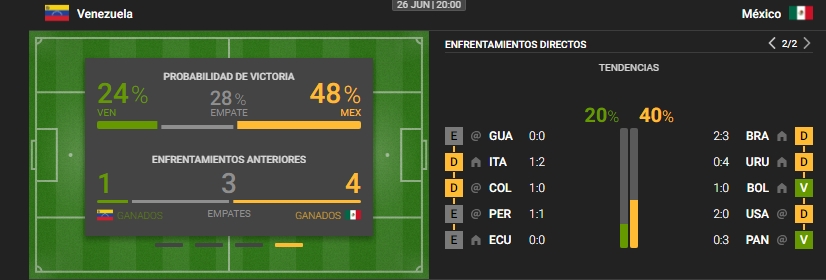 El mercado ve con más posibilidades que se dé una victoria de México ante un rival que ha elevado su nivel competitivo. La igualdad tiene una cuota más alta y la del triunfo de Venezuela es el doble que la del ‘tri’.