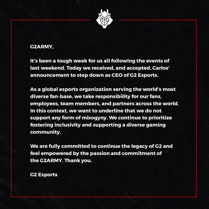El club y el propio implicado han publicado de manera oficial la salida de Carlos Rodríguez de G2. El equipo con un comunicado y el ex CEO con un vídeo, propio a su estilo.